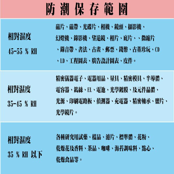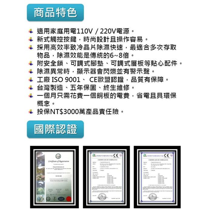 ✔採用新型觸控式按鍵 ✔採用高效率致冷晶片 ✔最適合多次存取物品 ✔省電且具環保概念 長暉Chang Hui電子式晶片除溼防潮箱215公升 一個月只需一個銅板電費,省電且具環保概念! 環保愛地球的同時,還可以保護珍貴物品,不讓心愛的物品變質及受潮! 台灣為海島型氣候,空氣中的鹽分及濕氣極易造成貴重物品及珍貴資料發霉、變質、氧化!! 給貴重物品及珍貴資料一個家,一台具有控溼、抗氧化、防潮、防霉的防潮箱! 400x480x1300mm 215公升 #防潮箱 #防霉 #高品質 #收藏品 #相機鏡頭 #乾燥 #乾燥食品 #單眼 #相片 #電器用品 #光碟 #攝影機 #電子防潮箱 |