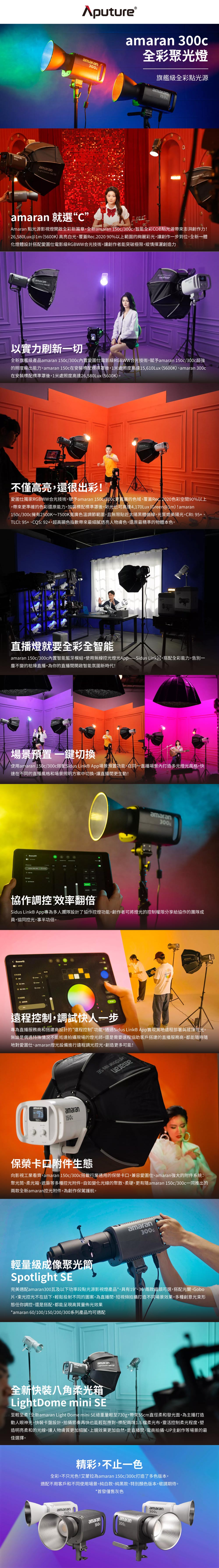 | * Aputure 愛圖仕獨家電影級RGBWW合光技術 * amaran 150c 1米處照度高達15,610Lux(5600K) * 覆蓋Rec. 2020色彩空間90%以上,帶來更準確的色彩還原能力 * amaran 150c/300c內置智能藍牙模組 * 搭配Sidus Link®️App場景預置功能 * 專為直播服務商和搭建商設計的“遠程控制”功能 |