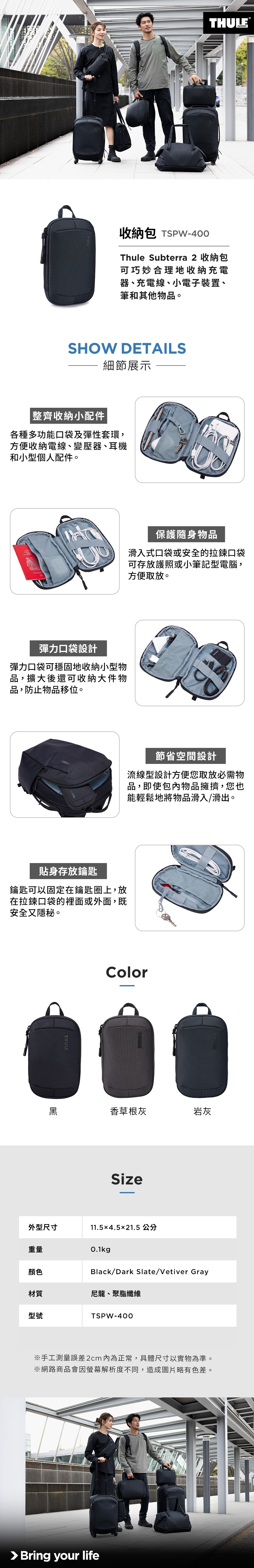 *各種多功能口袋及彈性套環,方便收納電線、變壓器、耳機和小型個人配件 *滑入式口袋或安全的拉鍊口袋可存放護照或小物品,方便取放 *彈力口袋可穩固地收納小型物品,擴大後還可收納大件物品,防止移位 *流線型設計方便您取放必需物品,能輕鬆地將物品滑入/滑出 *附鑰匙鍊條可貼身存放鑰匙 *採用YKK拉鍊和800D尼龍,具有防水塗層,不含對環境有害的PFC化學品 |